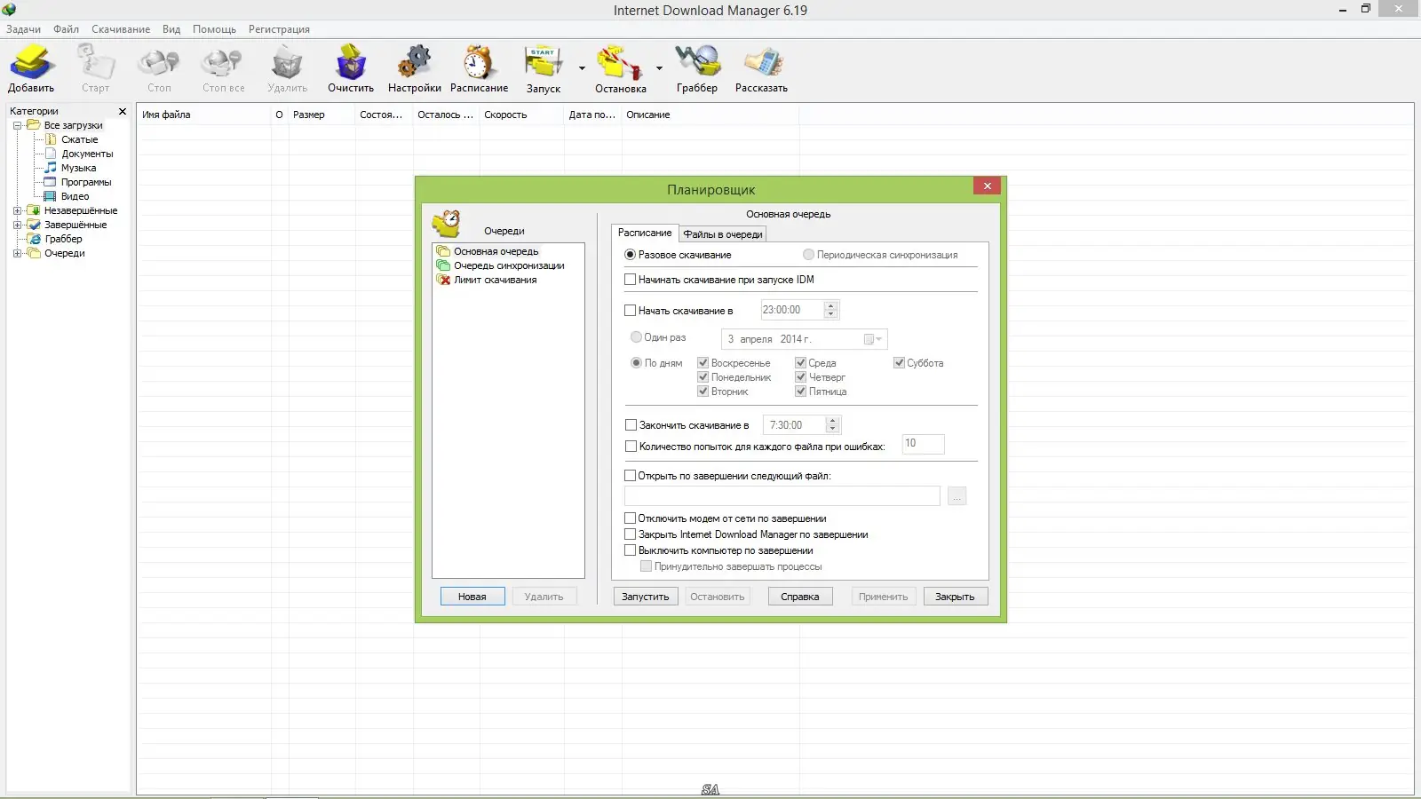 - Позволяет запланировать закачку на определённое время суток, что удобно при ограниченной пропускной способности в дневные часы.