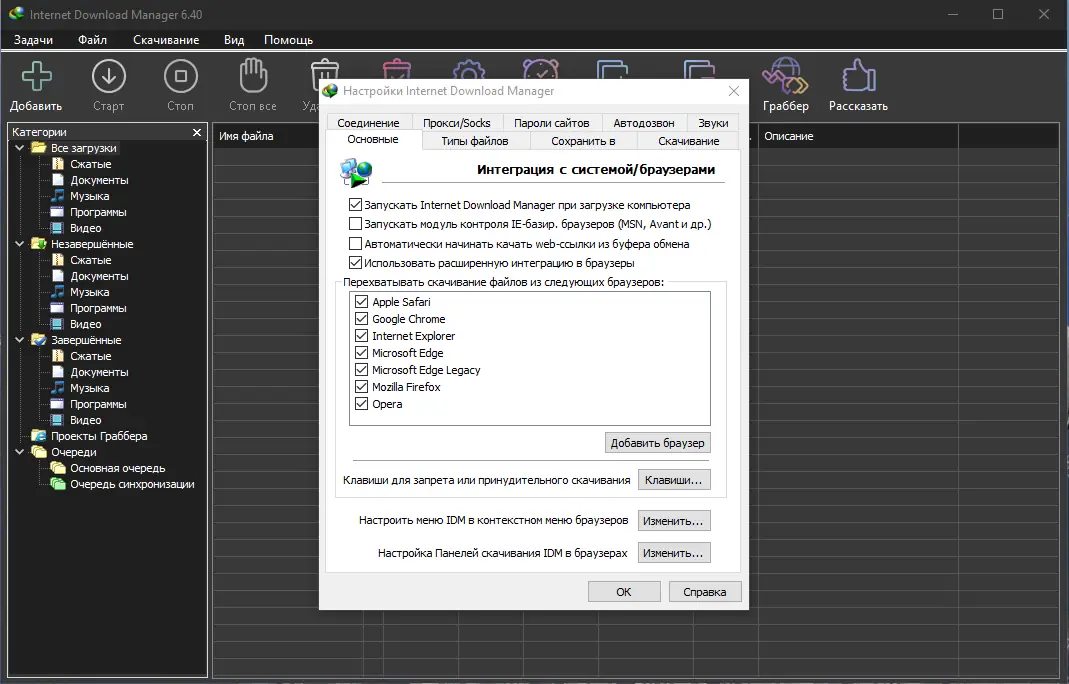 Программа эффективно работает с большинством браузеров и поддерживает автоматическое перехватывание ссылок на загрузку.