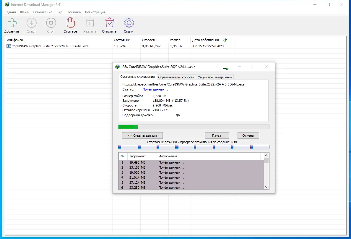 - Программа использует технологию динамической сегментации, разбивая файлы на части для параллельной загрузки и увеличения общей скорости.