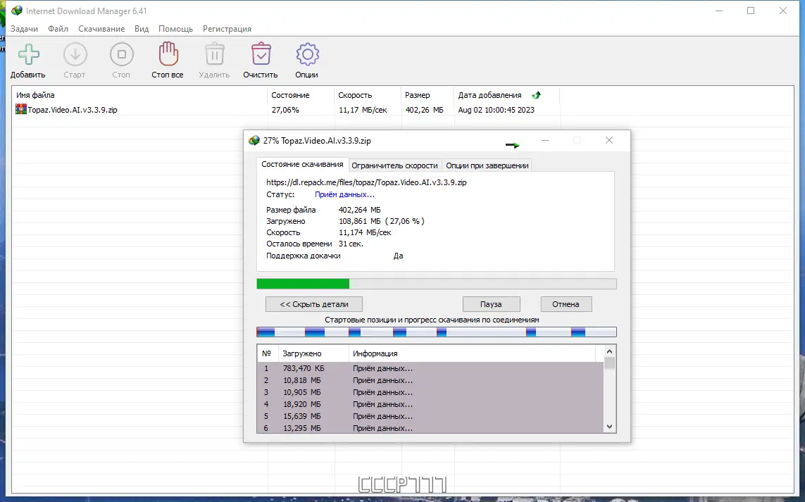 Программа использует технологию динамической сегментации, разбивая файл на части для параллельной загрузки.