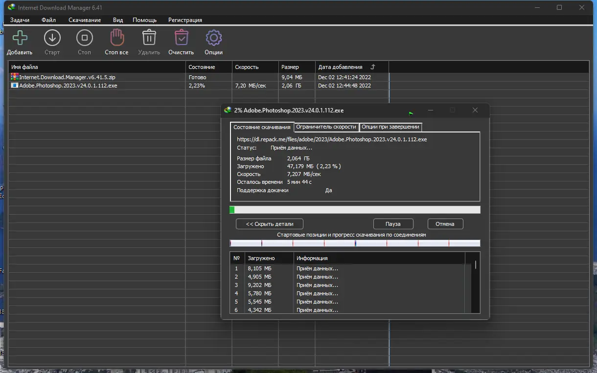 Internet Download Manager — это мощный менеджер загрузок, разработанный для оптимизации процесса скачивания контента из сети. Программа поддерживает динамическую сегментацию файлов, разбивая их на части и загружая параллельно, что значительно повышает скорость. Технология многопоточной передачи данных позволяет эффективно использовать пропускную способность канала, минимизируя простои и простои при обрыве соединения.