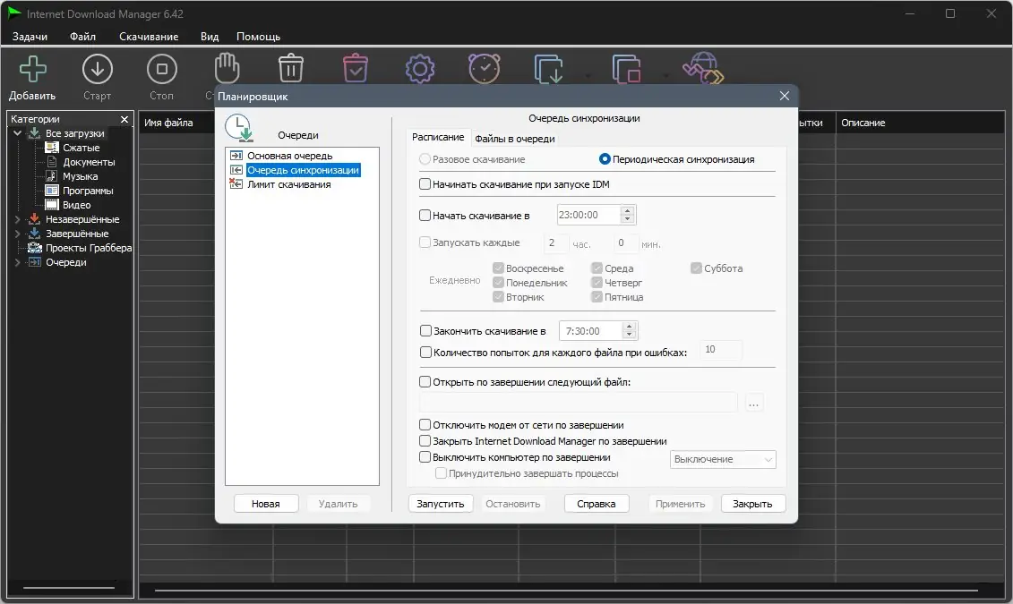 - Гибкое управление очередью загрузок и расписанием