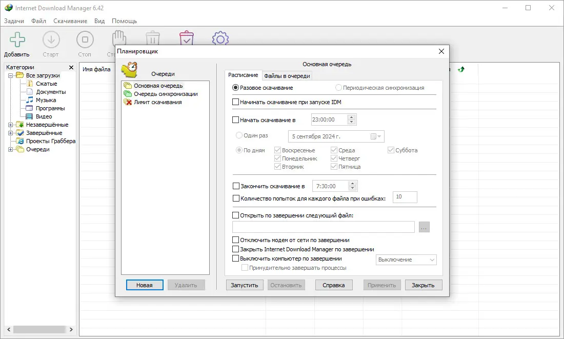 - Гибкое управление очередью загрузок и расписанием