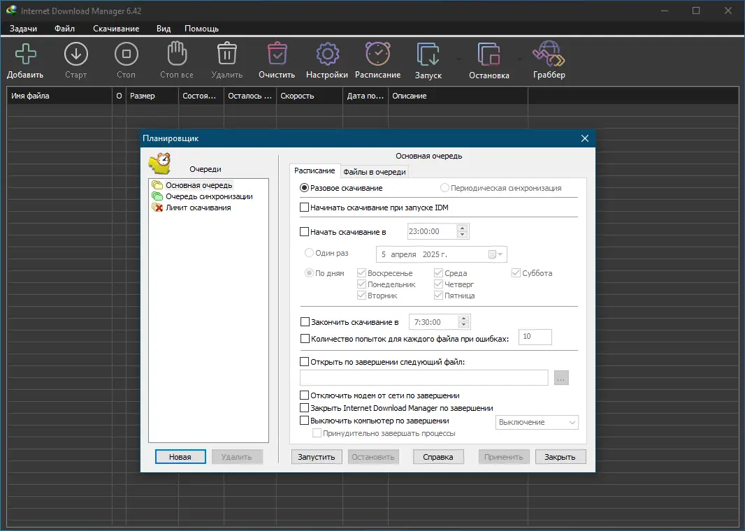 - Гибкое расписание закачек с возможностью отложенного старта