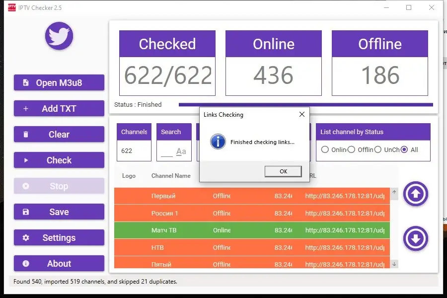 Программа IPTV Checker предназначена для автоматизации проверки плейлистов IPTV-каналов в форматах m3u8, m3u и txt. Она позволяет быстро анализировать доступность каналов, формировать отчёты и управлять списками с высокой точностью и гибкостью. С её помощью можно определить, какие каналы работают стабильно, а какие требуют замены или настройки. Утилита поддерживает многопоточную проверку, настраиваемые параметры тайм-аута и количество попыток подключения. Интерфейс отображает статус каждого канала — онлайн, офлайн или не проверен, что упрощает процесс фильтрации и сортировки. Программа также интегрируется с VLC, позволяя запускать каналы напрямую. Это удобный инструмент для пользователей, которые регулярно работают с IPTV-списками и стремятся поддерживать их в актуальном состоянии.