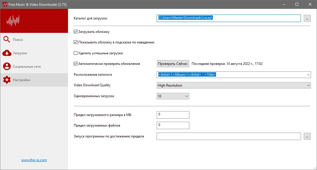 - Гибкие настройки загрузки: ограничение скорости, сортировка, выбор качества
