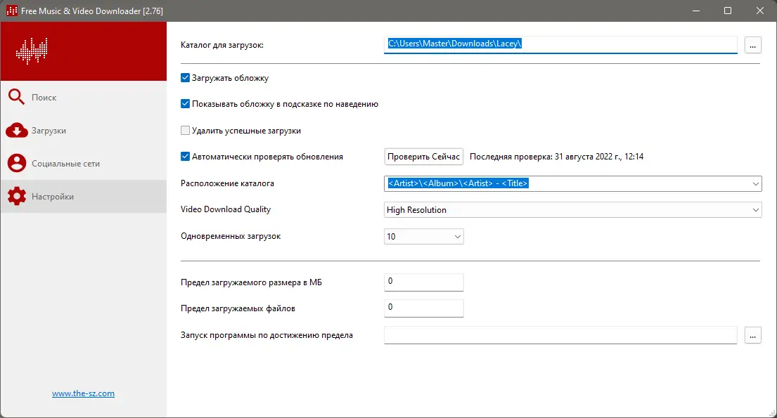 Использование приложения начинается с ввода поискового запроса в основное поле. После этого система сканирует подключённые ресурсы и выводит список доступных треков или видео. Пользователь может предварительно прослушать или посмотреть фрагмент, выбрав нужный результат, и запустить загрузку одним кликом. В настройках можно указать папку для сохранения, включить автоматическую сортировку по папкам и загрузку обложек в формате JPEG. При необходимости активируется конвертация видео в аудио, а также настраивается максимальный размер файла и количество одновременных закачек. Особая опция позволяет запускать заданный исполняемый файл после достижения лимита загрузок, что полезно для автоматизации задач.