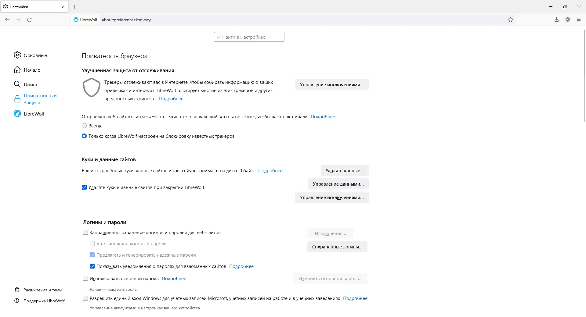 LibreWolf создан как независимая ветка Mozilla Firefox, но с полным отказом от встроенной телеметрии и других компонентов, собирающих данные. Этот браузер изначально настроен на защиту личной информации, предлагая приватный веб-серфинг без необходимости ручного изменения десятков параметров. Все настройки направлены на снижение цифрового следа, оставляемого пользователем при посещении сайтов.