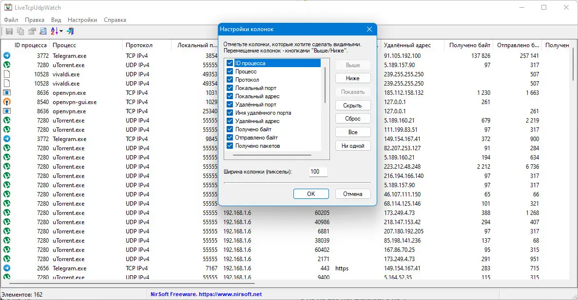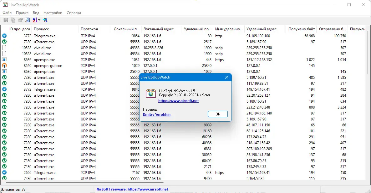LiveTcpUdpWatch — это легковесная утилита для мониторинга сетевой активности в реальном времени, отслеживающая все TCP и UDP события в системе. Программа отображает детальную информацию о каждом сетевом соединении, включая адреса, порты, объёмы переданных данных и процессы, инициировавшие обмен.