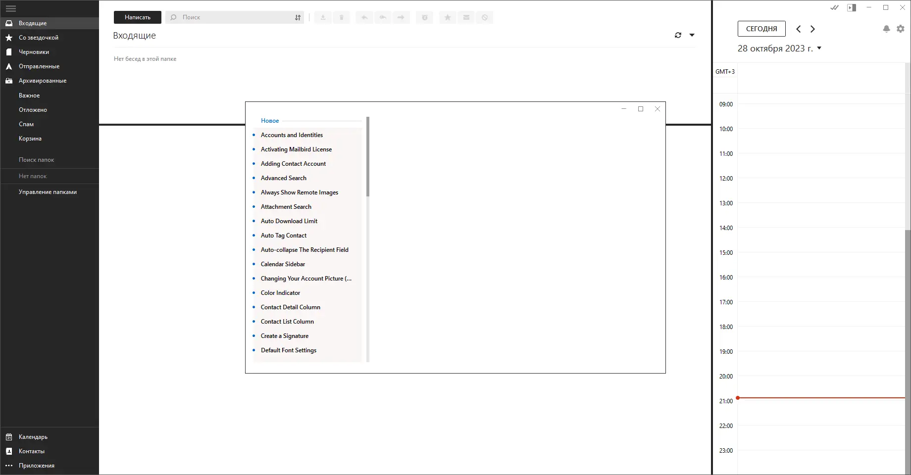 Mailbird представляет собой лёгкий и производительный почтовый клиент, ориентированный на пользователей, ценящих скорость и простоту. Интерфейс разделён на три основные зоны: слева — папки и ярлыки, в центре — цепочки писем, справа — содержимое выбранного сообщения. Ниже отображаются интегрированные приложения, такие как календарь, мессенджеры и менеджеры задач. Программа автоматически обновляется, обеспечивая доступ к последним функциям и улучшениям безопасности.