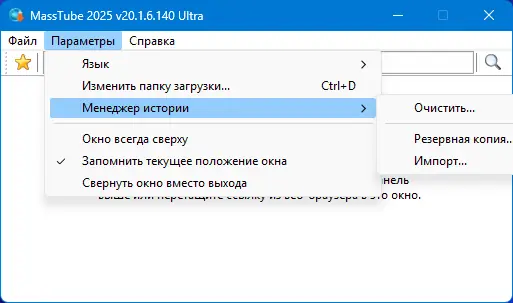 - Ведётся детальная история загрузок и поисковых запросов для быстрого доступа к ранее найденному.