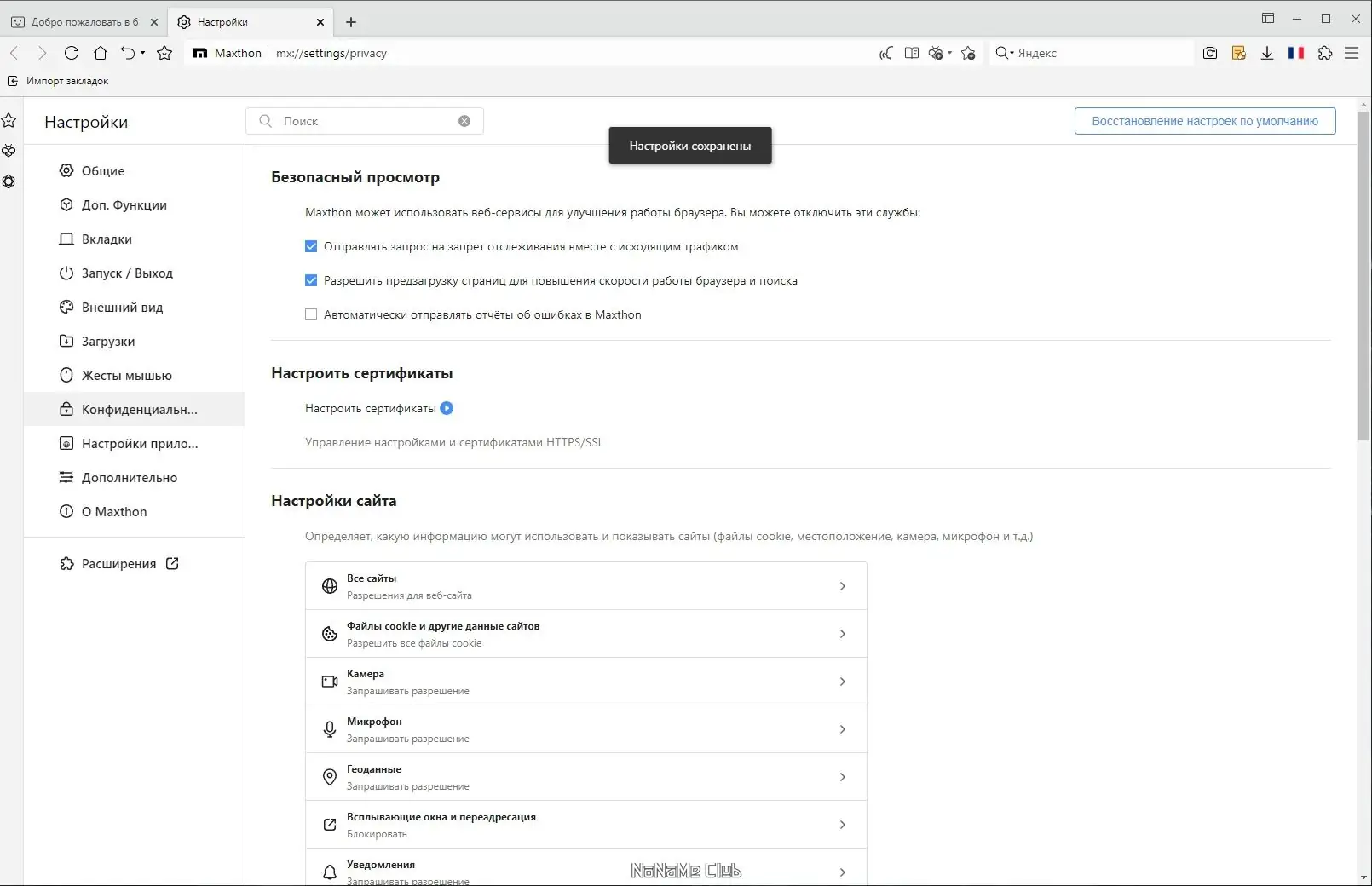 - Гибкие настройки приватности, включая блокировку трекеров, управление куками и интеграцию с прокси-серверами.