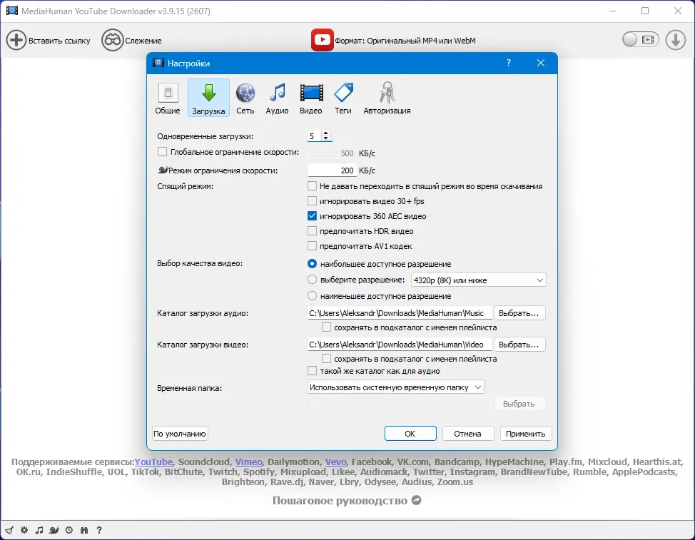 MediaHuman YouTube Downloader — это удобное приложение для загрузки видео и аудио с YouTube и других популярных платформ. Программа поддерживает высокие разрешения, включая 4K и 8K, а также позволяет сохранять только звуковую дорожку. Скачать контент можно как по отдельности, так и целыми плейлистами или каналами, что делает использование сервиса максимально эффективным.