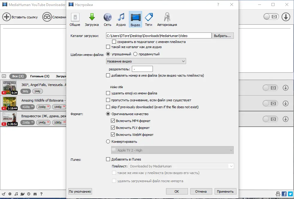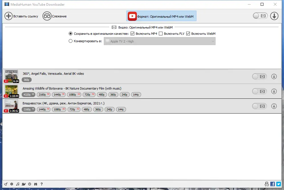 Качество загружаемого видео соответствует оригиналу, включая высокие разрешения и битрейты