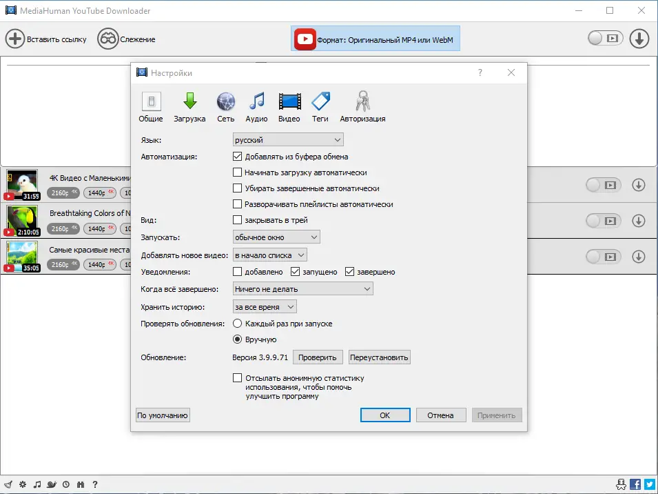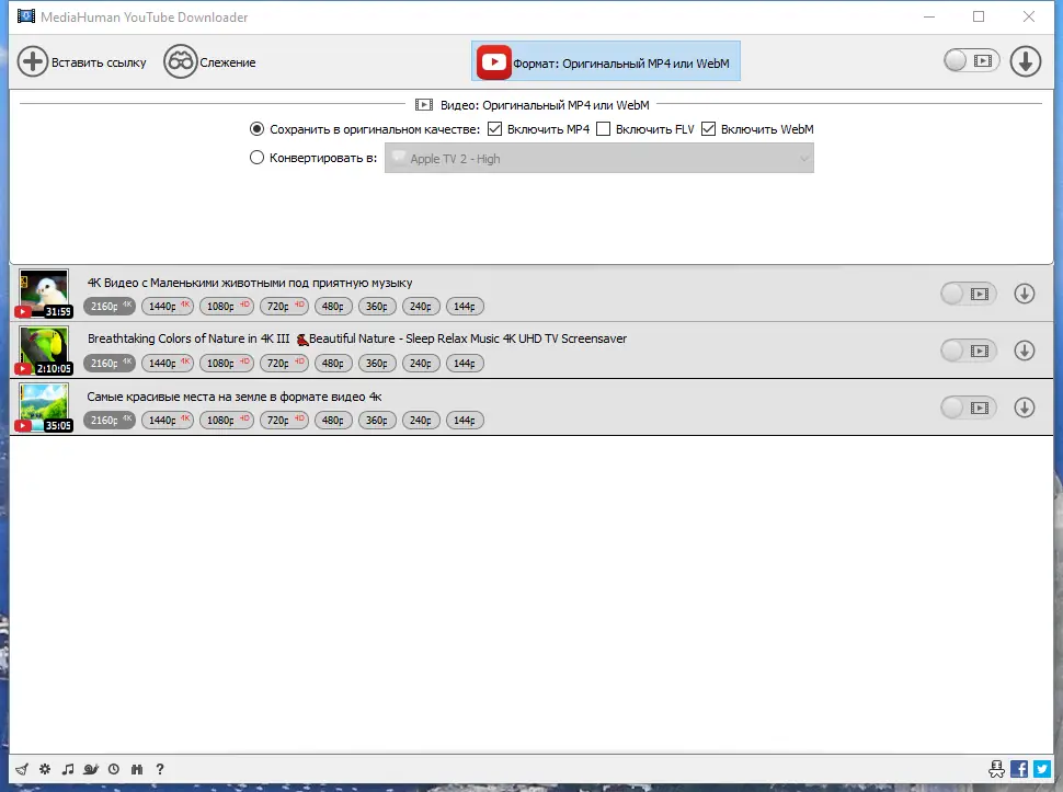 Программа сохраняет оригинальное качество контента, позволяя загружать видео в разрешениях до 8K.