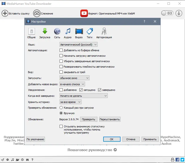 - Поддержка загрузки целых плейлистов и каналов с возможностью отслеживания новых видео.