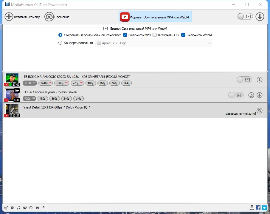 - Скачивает видео и аудио в высоком качестве, включая 4K и 8K.