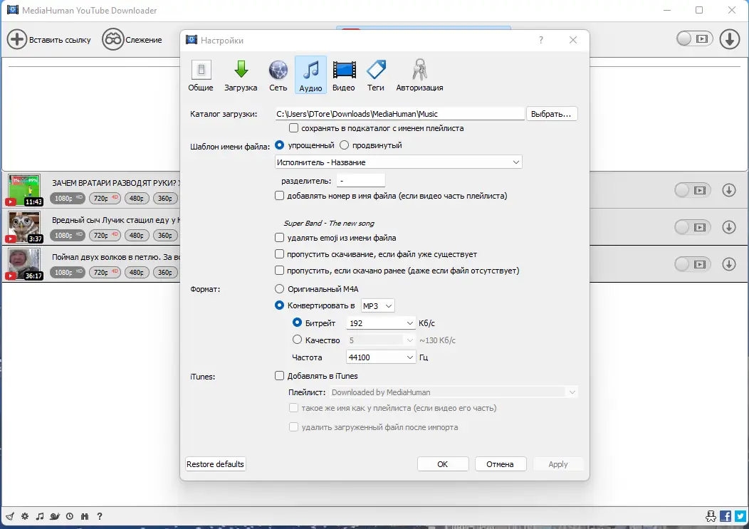 - Автоматическое добавление скачанных файлов в iTunes/Music.app с указанием тегов