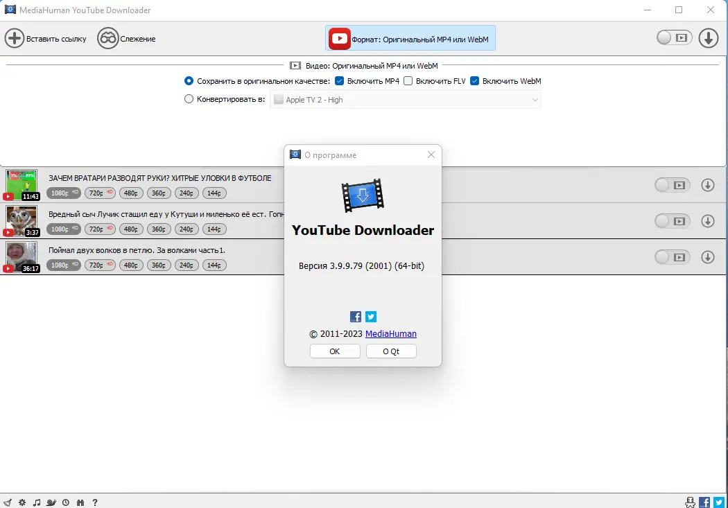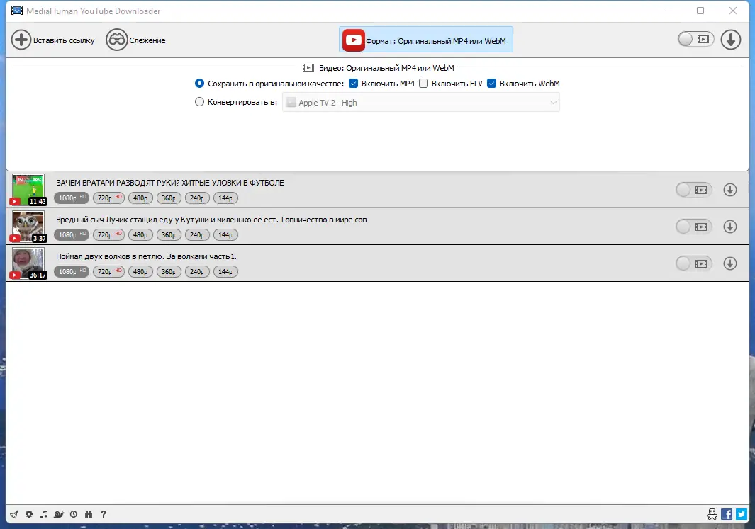 MediaHuman YouTube Downloader — это инструмент для скачивания видеоматериалов с YouTube, а также с других видеосервисов, таких как Vimeo, Rutube, Dailymotion и многих других. Приложение поддерживает высокие разрешения, включая 4K и 8K, и дает возможность извлекать аудиодорожки для прослушивания в автономном режиме. Утилита подходит как для разовых загрузок, так и для регулярного сохранения обновлений с любимых каналов.