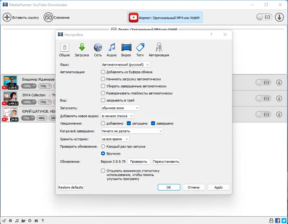 - Загрузка новых видео из отслеживаемых каналов и плейлистов без ручного вмешательства.