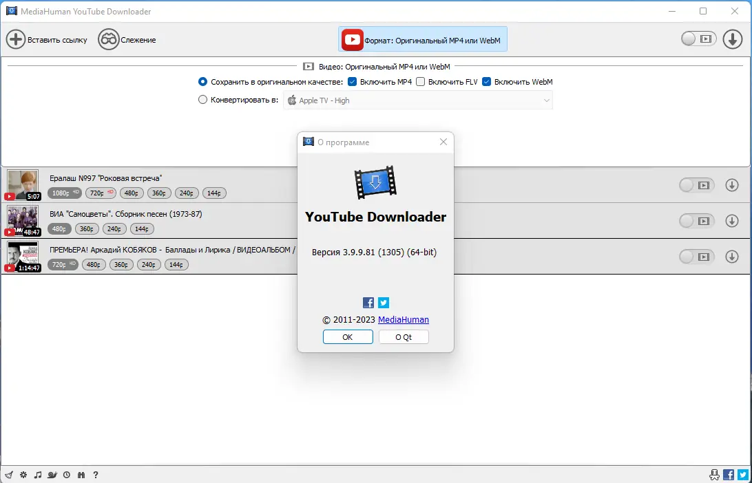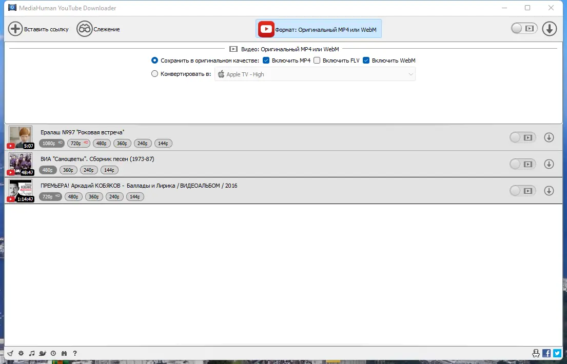 MediaHuman YouTube Downloader — удобное приложение для загрузки видео и аудио с YouTube и других популярных платформ. Программа поддерживает скачивание в высоком качестве, включая разрешения до 8K, а также конвертацию в аудиоформаты. С её помощью можно сохранять целые плейлисты, каналы и автоматически следить за обновлениями.