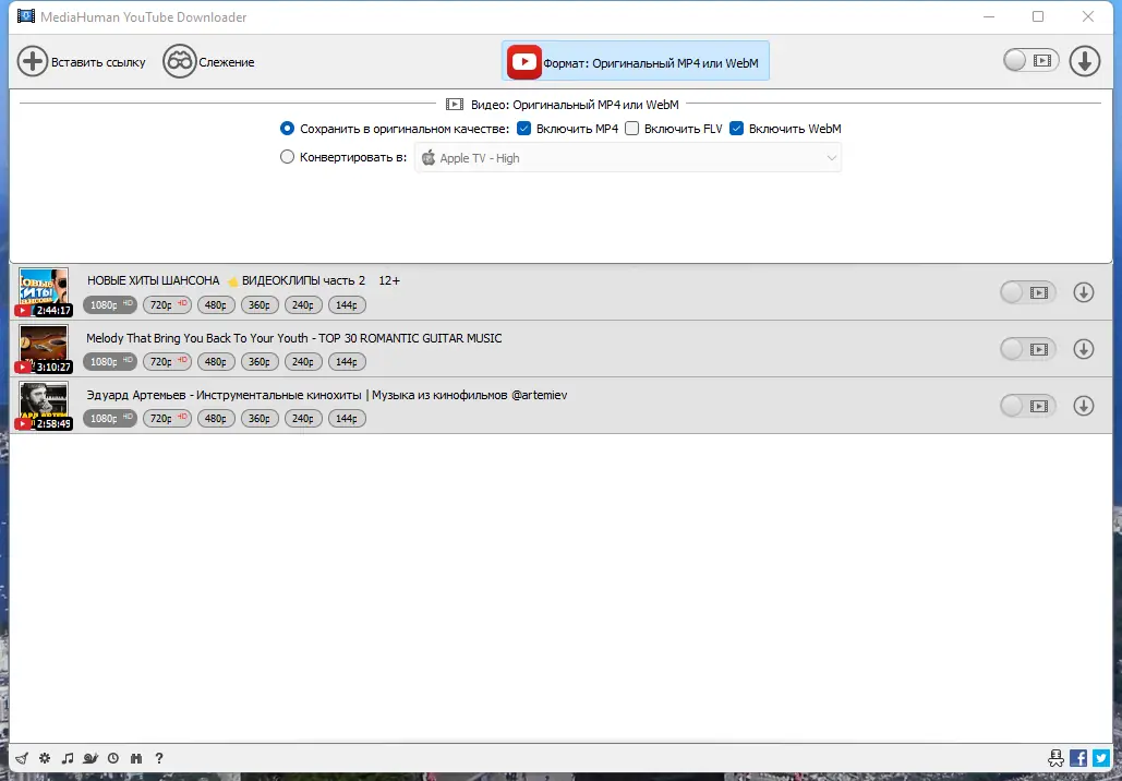 Программа MediaHuman YouTube Downloader позволяет сохранять видео и аудио с YouTube и других популярных платформ в высоком качестве. Поддерживает загрузку отдельных роликов, плейлистов, каналов, а также автоматическое скачивание новых видео.