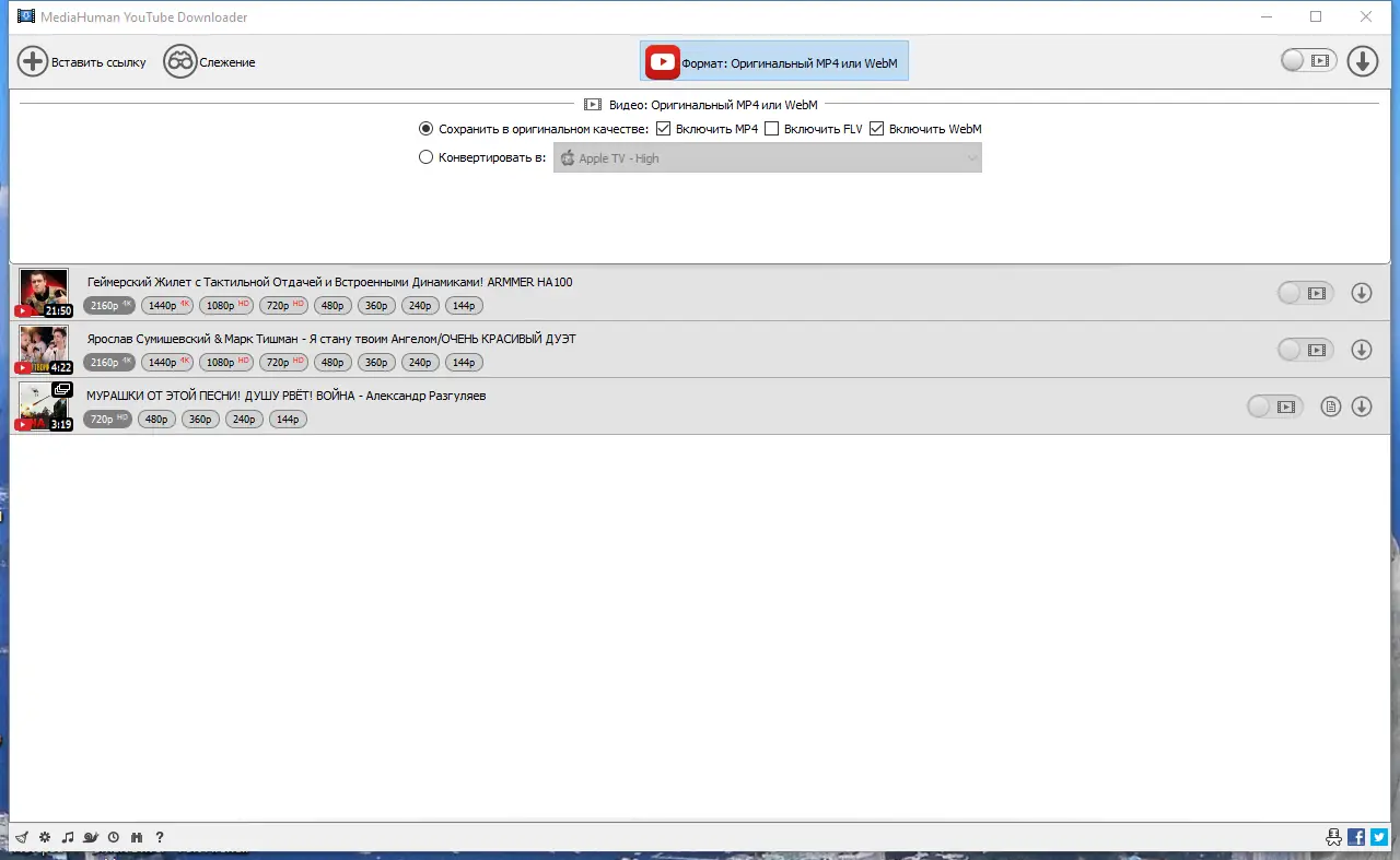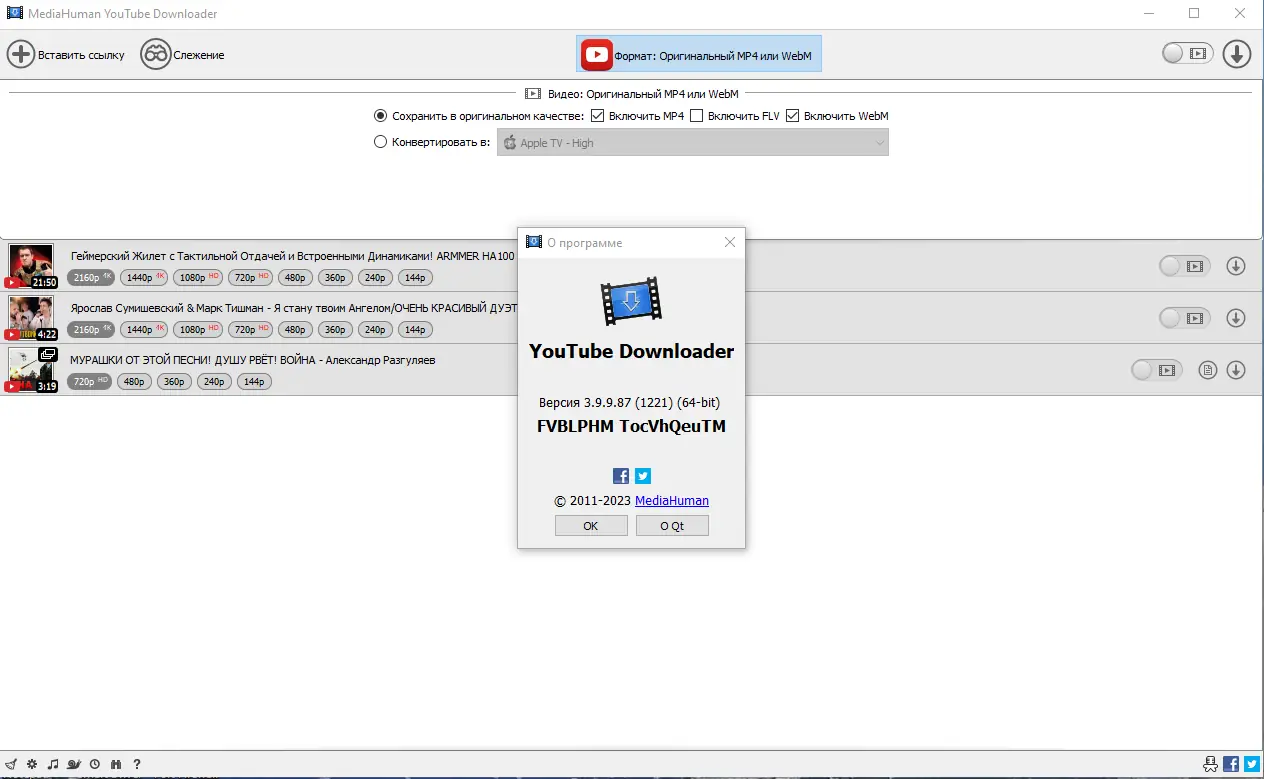 MediaHuman YouTube Downloader — это инструмент для сохранения мультимедиа с YouTube и более чем пятидесяти других онлайн-платформ. Приложение позволяет получать доступ к контенту в удобное время, независимо от подключения к интернету. Поддерживается скачивание как отдельных роликов, так и целых плейлистов, каналов, включая автоматическое обновление новых видео.