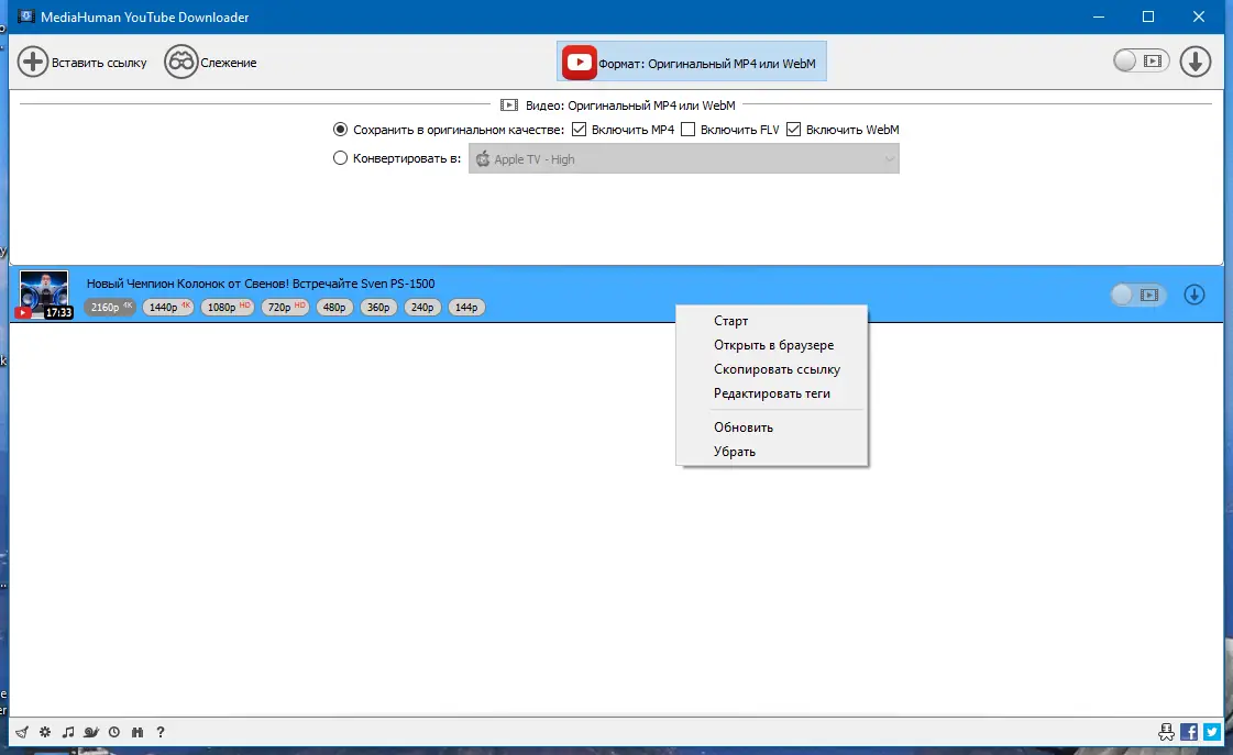 MediaHuman YouTube Downloader — удобное приложение для загрузки видео и аудио с YouTube и других популярных платформ. Программа поддерживает высокие разрешения, включая 4K и 8K, а также позволяет сохранять звук отдельно, конвертируя в MP3 и другие форматы. С его помощью можно скачивать целые плейлисты и каналы, автоматически добавляя новые видео по мере их появления.