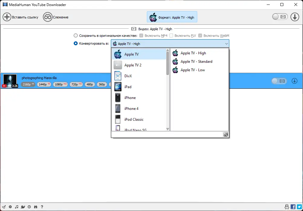 MediaHuman YouTube Downloader — это многофункциональный инструмент, предназначенный для скачивания видео и аудио с популярных онлайн-платформ. Он работает не только с YouTube, но и с такими сервисами, как Vimeo, Rutube, Dailymotion, Facebook, ВКонтакте, OK.ru, SoundCloud и многими другими. Пользователь может выбирать разрешение от 360p до 8K, включая поддержку 60 кадров в секунду, а также извлекать звуковую дорожку в формате MP3, AAC, WAV и других.