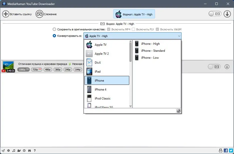 MediaHuman YouTube Downloader — удобная программа для скачивания видео и аудио с YouTube и других платформ. Она поддерживает загрузку отдельных роликов, целых плейлистов и каналов, включая автоматическое обновление новых материалов. Возможна конвертация в аудио и сохранение в оригинальном качестве.