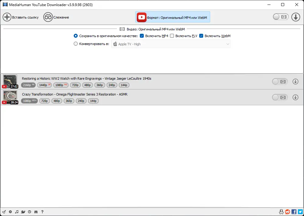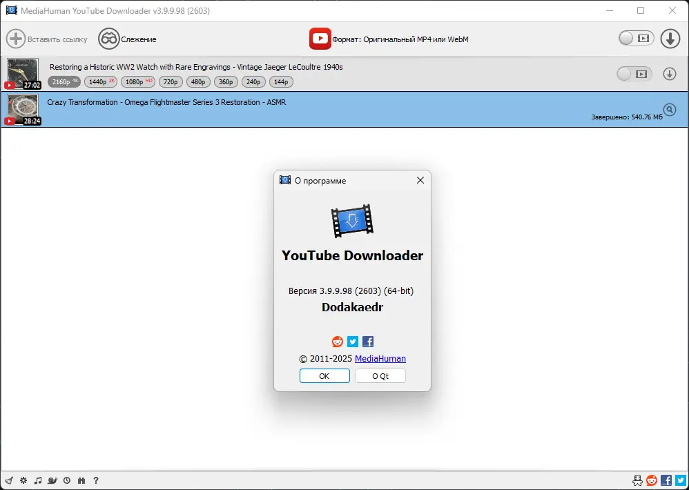 MediaHuman YouTube Downloader — удобное приложение для загрузки видео и аудио с YouTube и других популярных платформ. Программа поддерживает скачивание в высоком качестве, включая форматы 4K и 8K, а также позволяет извлекать звуковые дорожки. С её помощью можно сохранять отдельные ролики, целые плейлисты и каналы для оффлайн-просмотра.