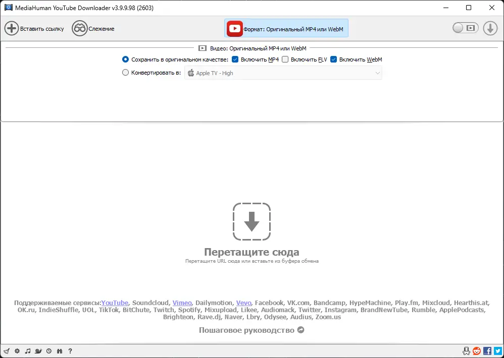 MediaHuman YouTube Downloader — это многофункциональный инструмент, предназначенный для быстрого и удобного скачивания контента из интернета. Приложение работает не только с YouTube, но и с такими сервисами, как Vimeo, Rutube, Dailymotion, Facebook, ВКонтакте и SoundCloud. Пользователи могут выбирать нужное разрешение видео, включая 720p, 1080p, 4K и даже 8K, а также загружать аудиодорожки в форматах MP3, AAC и других. Интерфейс программы интуитивно понятен, а процесс скачивания максимально автоматизирован.
