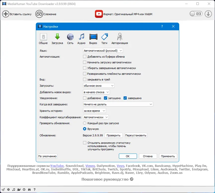MediaHuman YouTube Downloader — это удобное приложение для загрузки видео и аудио с YouTube и других популярных платформ. Программа позволяет сохранять контент в оригинальном качестве, конвертировать в нужный формат и автоматически добавлять в медиатеку. Поддержка множества сайтов и функций вроде слежения за каналами делает её универсальным решением для оффлайн-просмотра.