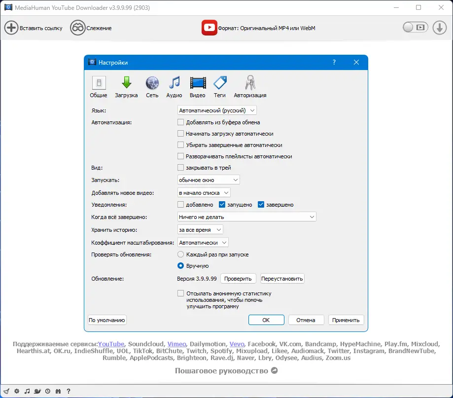 MediaHuman YouTube Downloader — это мощный инструмент для сохранения мультимедиа с онлайн-сервисов. Он работает не только с YouTube, но и с такими площадками, как Vimeo, Rutube, Dailymotion, Facebook, ВКонтакте, SoundCloud и многими другими. Приложение поддерживает одновременную загрузку нескольких файлов, что значительно ускоряет процесс. Пользователь может выбирать нужное качество: от 360p до 8K, а также загружать видео с частотой кадров 30 или 60 fps.