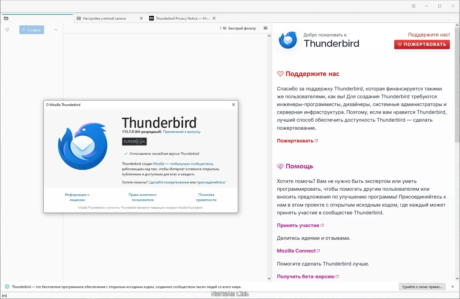 Последняя версия Mozilla Thunderbird доступна для скачивания бесплатно. Программа совместима с операционной системой для windows и поддерживает русский язык интерфейса. Установка проходит быстро, а автоматическая настройка упрощает первый запуск. Обновления поступают регулярно, обеспечивая стабильность и безопасность при работе с личными данными. Программа продолжает развиваться благодаря активному сообществу разработчиков и пользователям, вносящим свой вклад в улучшение функционала.