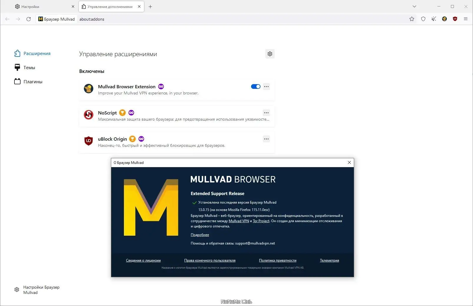 - Включает встроенные расширения NoScript и uBlock Origin для блокировки вредоносного кода и рекламы.