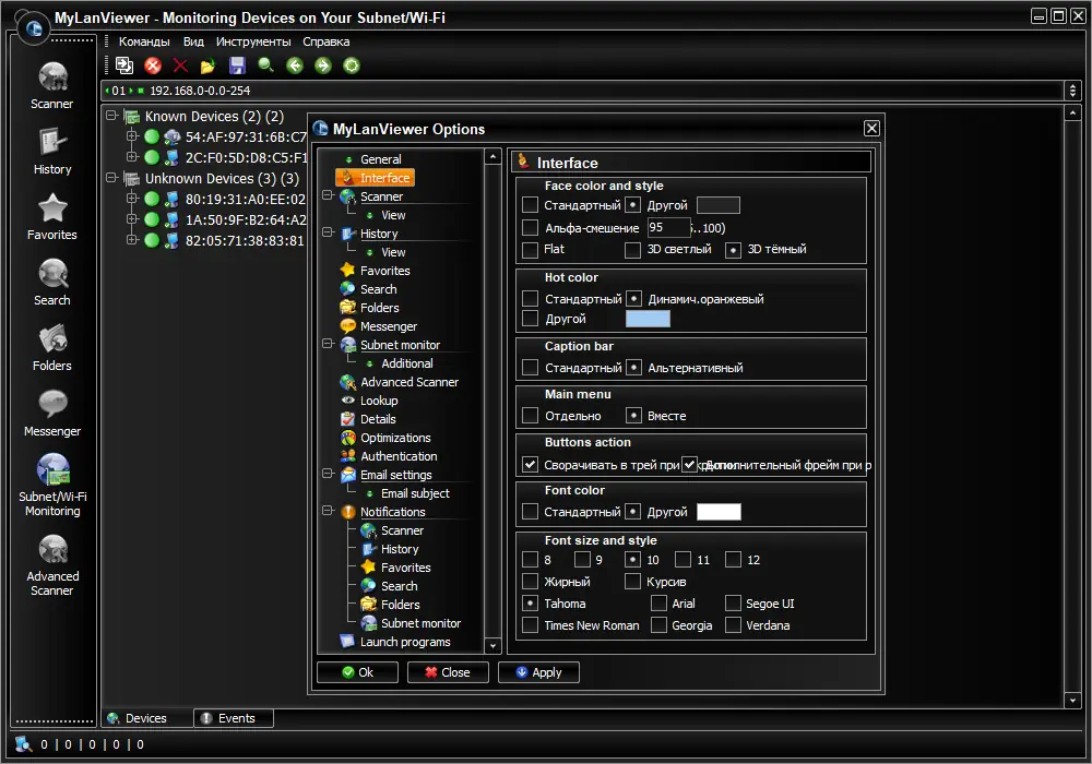 - Автоматическое сохранение данных о ранее найденных устройствах и гибкие настройки уведомлений.