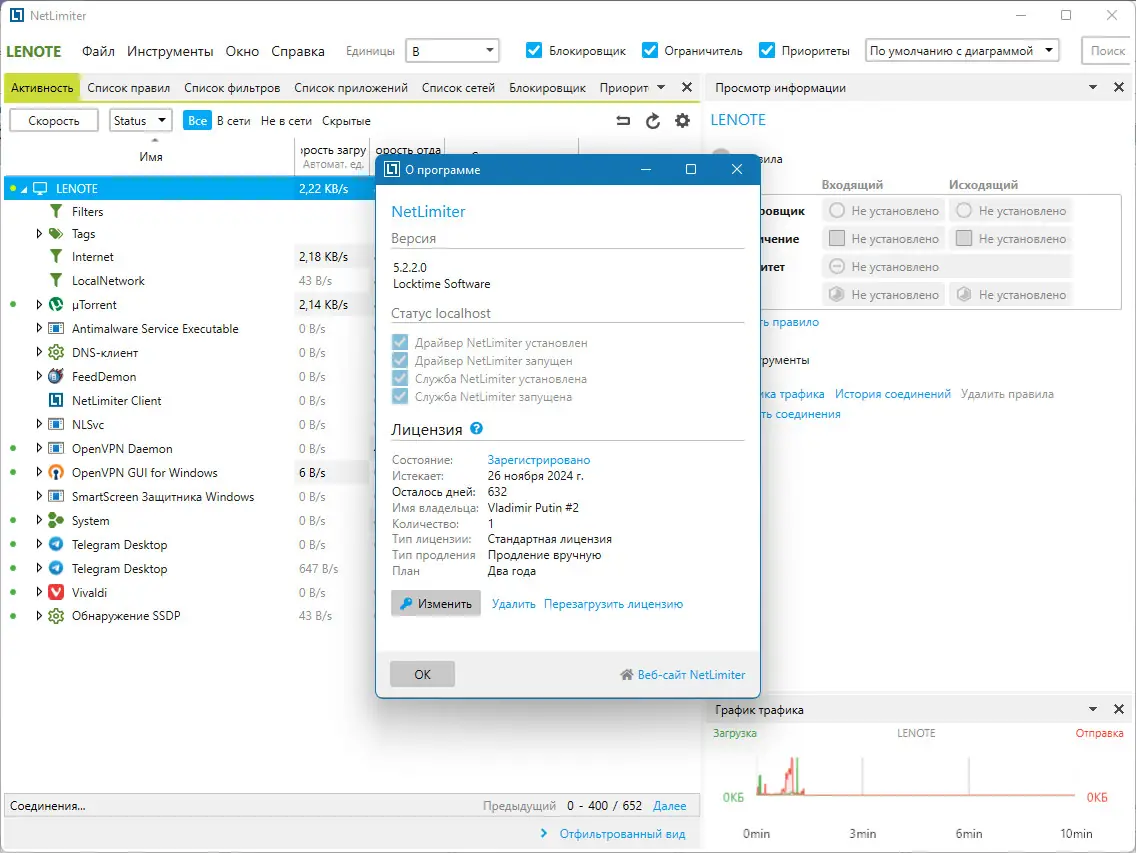 NetLimiter — это инструмент для детального контроля сетевого трафика на персональном компьютере, позволяющий отслеживать и управлять подключениями каждого приложения. Программа предоставляет пользователю полный контроль над скоростью передачи данных, включая ограничение, приоритезацию и блокировку соединений.