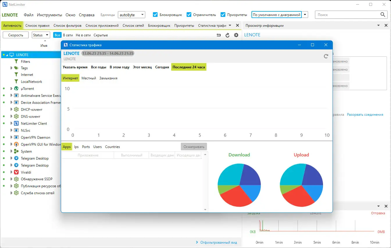 - Осуществляется детальный мониторинг трафика приложений и сетевых подключений с отображением в реальном времени.