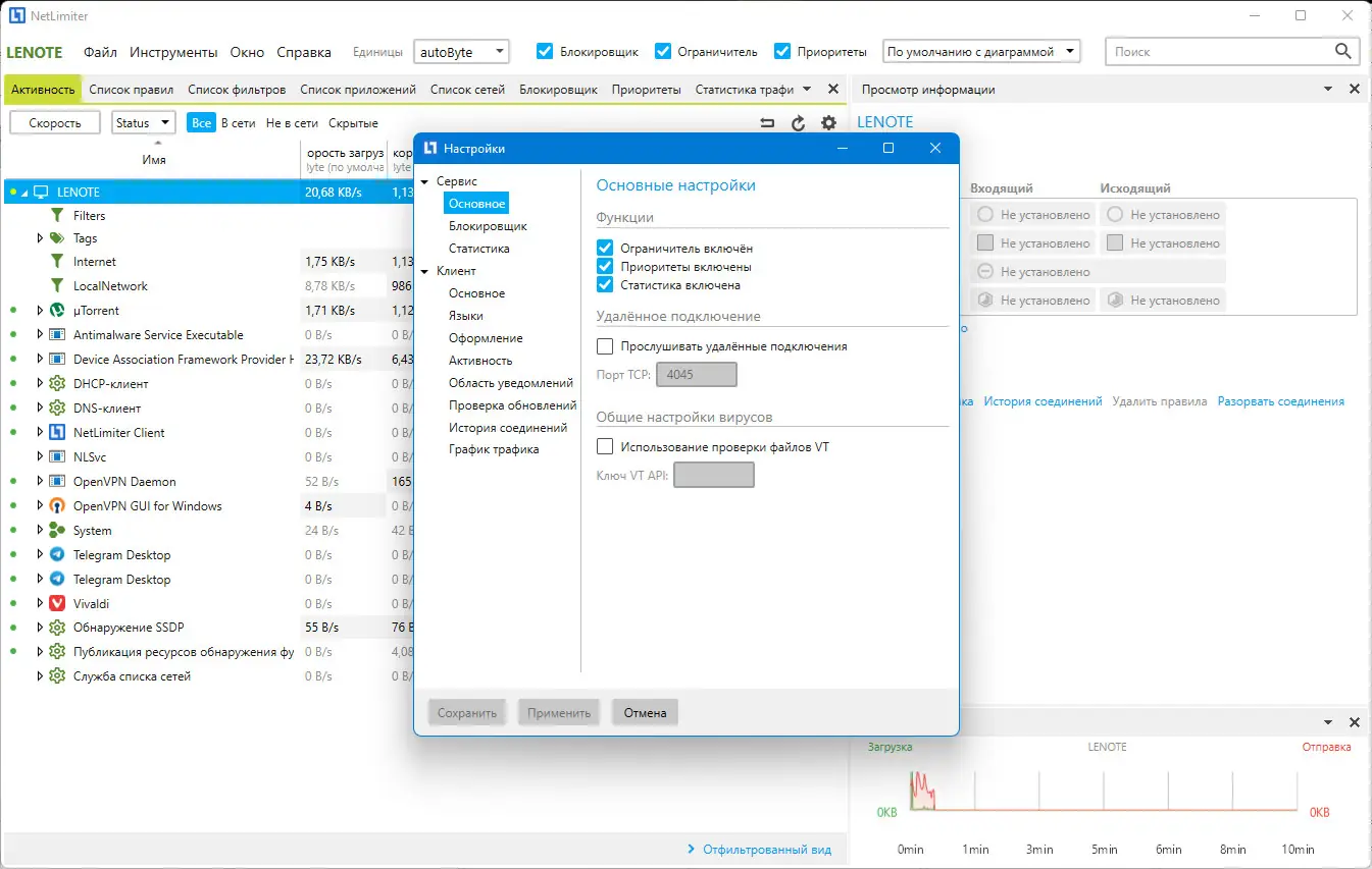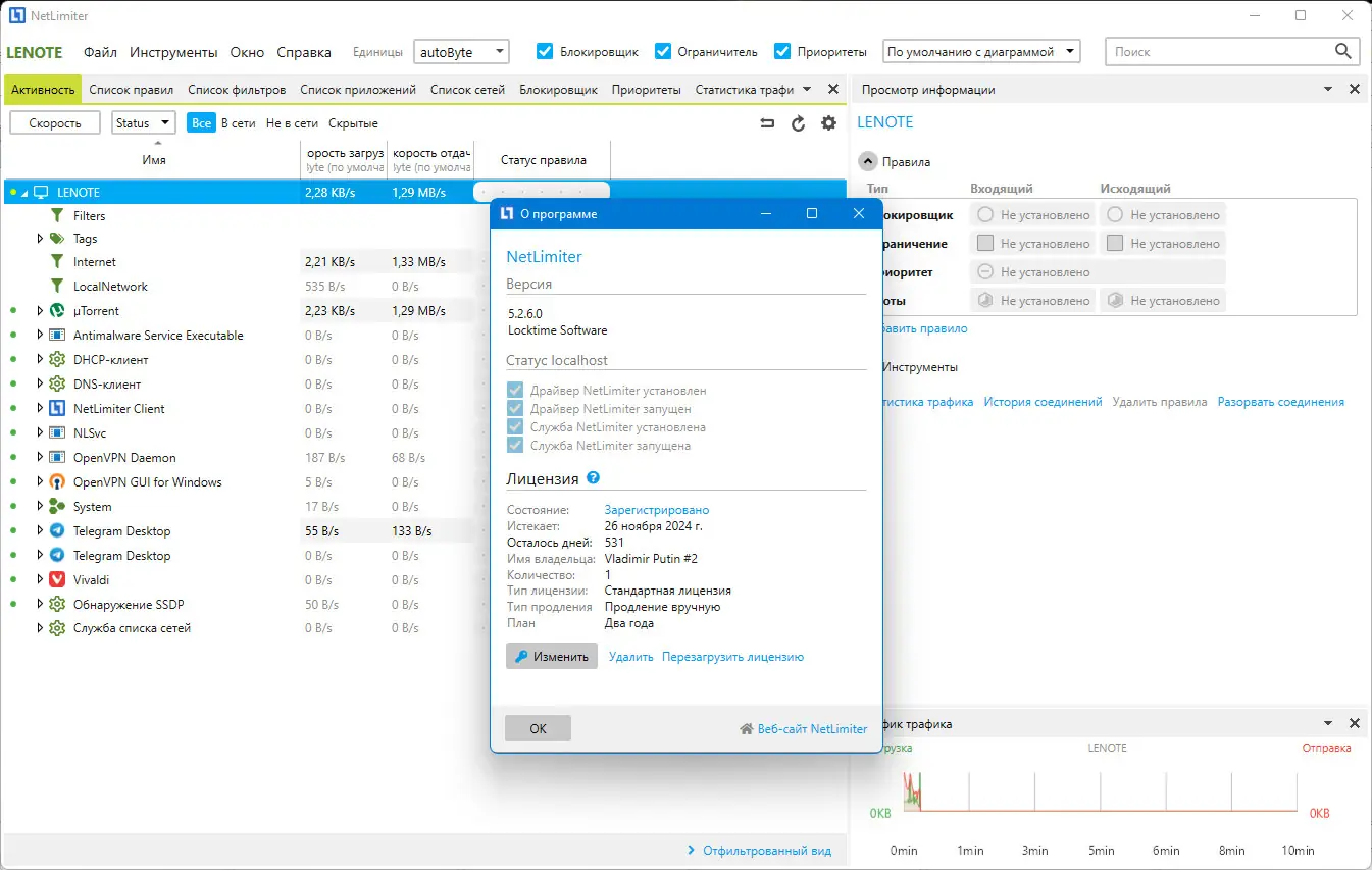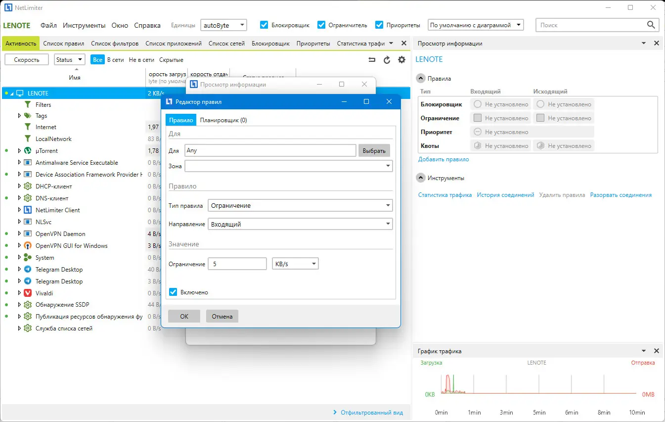 NetLimiter представляет собой комплексное решение для мониторинга и контроля сетевого трафика на персональном компьютере. Программа отслеживает каждое сетевое подключение, создаваемое приложениями, и предоставляет детальную информацию о количестве переданных и полученных данных. Интерфейс позволяет быстро определить, какие процессы потребляют наибольшую часть полосы пропускания, и вручную установить лимиты на их активность.