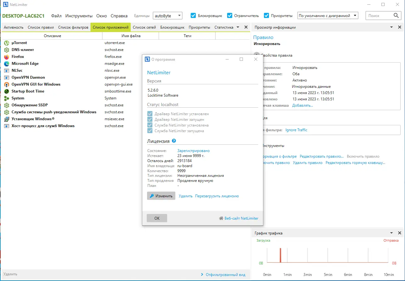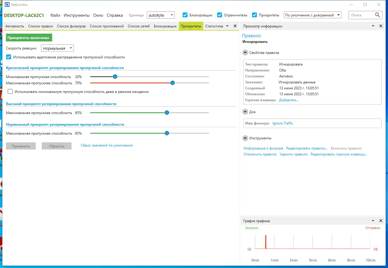 NetLimiter — это инструмент для детального контроля сетевого трафика на персональном компьютере, позволяющий отслеживать активность приложений в интернете и управлять скоростью их подключения. Программа предоставляет пользователям возможность ограничивать пропускную способность для отдельных процессов, настраивать приоритеты соединений и получать детальную статистику по использованию интернета.