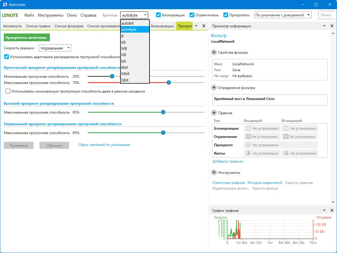 NetLimiter — это мощный инструмент для мониторинга и управления сетевым трафиком на персональном компьютере. Программа позволяет контролировать использование интернета каждым приложением, настраивать ограничения по скорости и приоритизировать соединения. Благодаря детальной статистике и гибким настройкам, пользователь получает полный контроль над сетевой активностью системы.