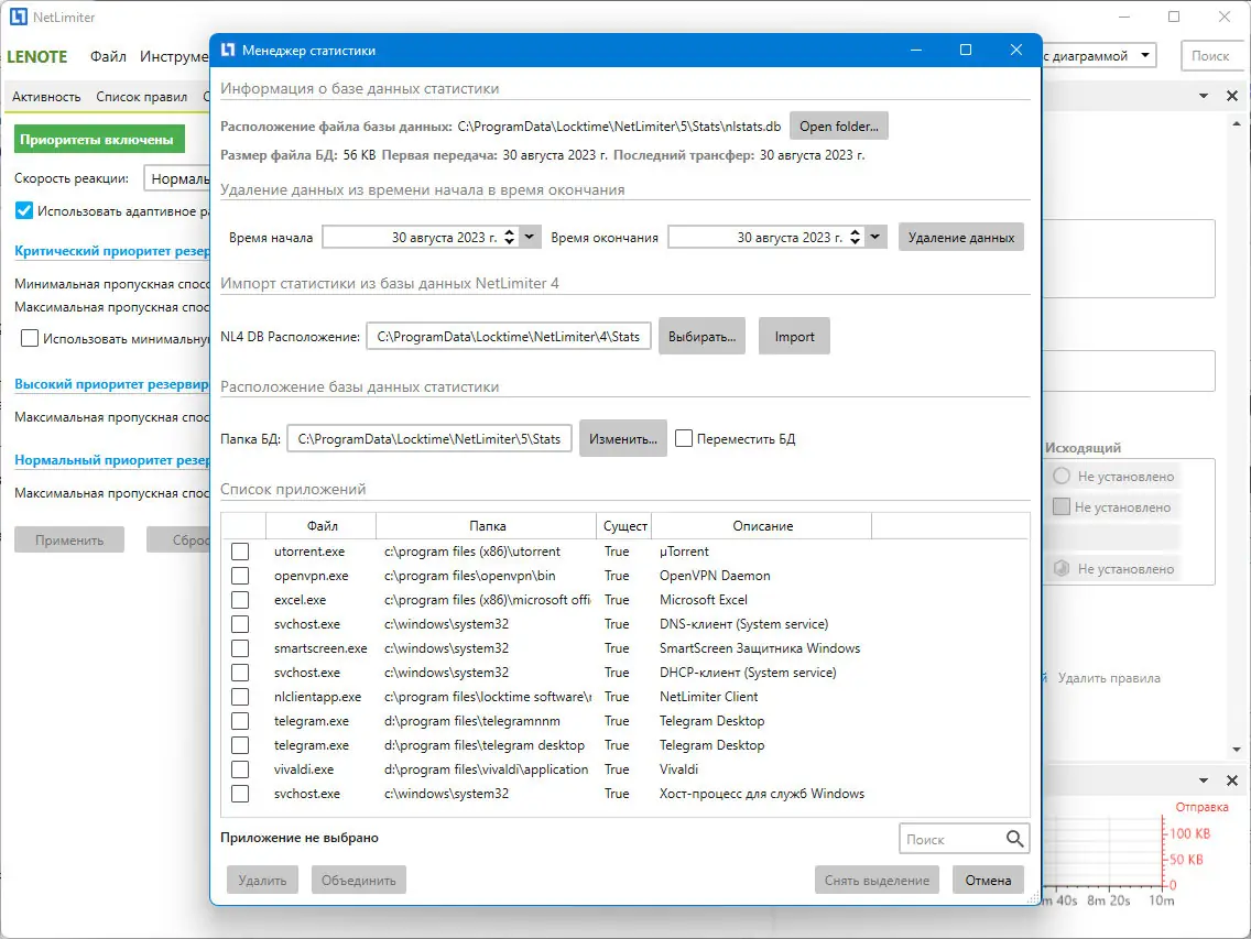 После установки программа начинает автоматически отслеживать все сетевые подключения. В главном окне отображается список всех активных приложений с указанием текущей скорости загрузки и выгрузки. Пользователь может создать правило для любого процесса: задать максимальную скорость, заблокировать доступ или назначить приоритет. Фильтры позволяют настроить правила по IP-адресам, портам, протоколам и другим параметрам. Также доступен планировщик, который включает или отключает определённые правила в заданное время. Удалённое администрирование даёт возможность управлять настройками с другого устройства, что удобно в корпоративных сетях. Каждому пользователю системы можно назначить свои права доступа, ограничив или разрешив внесение изменений в конфигурацию.