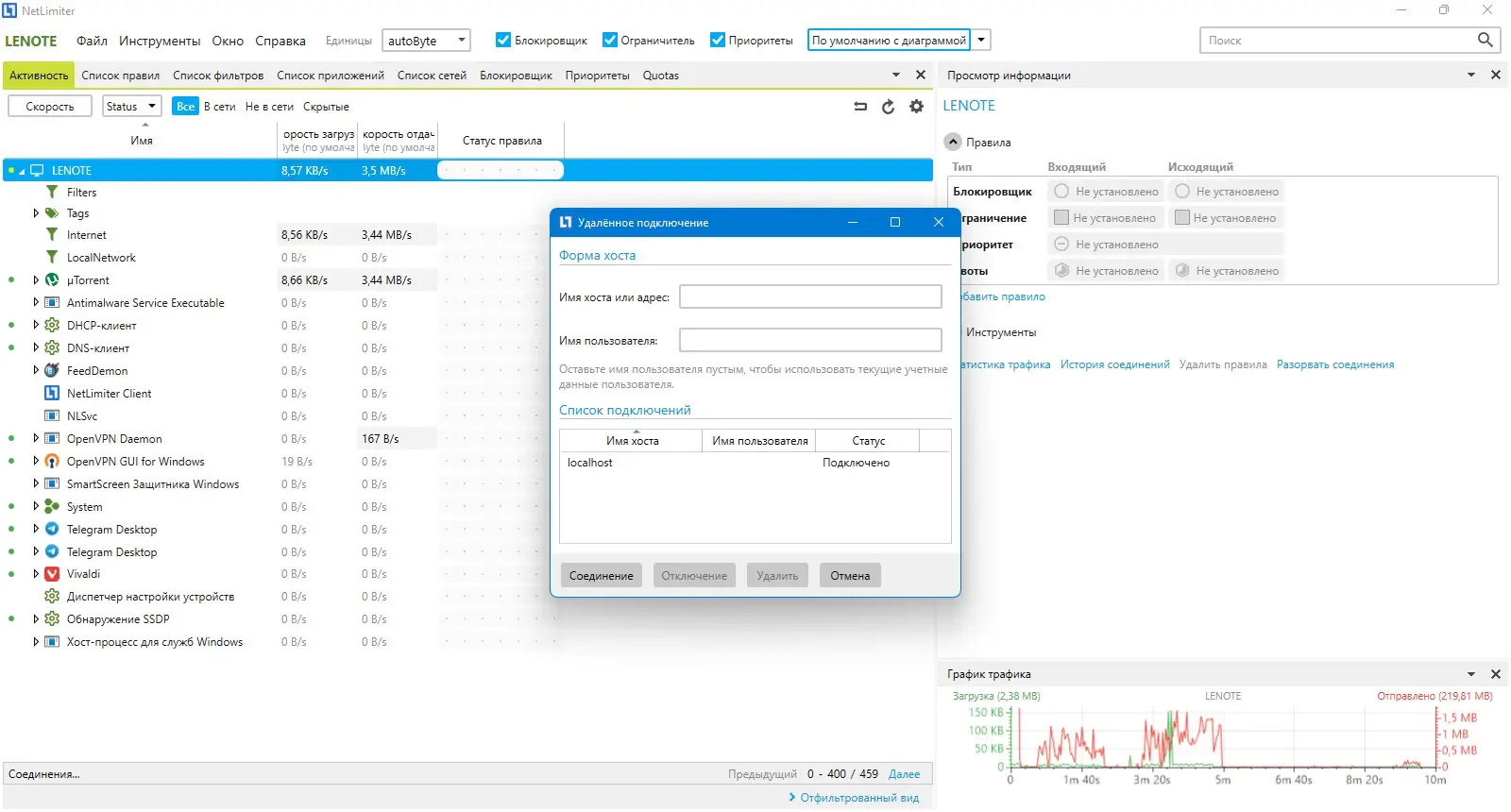 Программа сочетает функции сетевого монитора и администратора трафика, обеспечивая полный контроль над сетевыми подключениями.