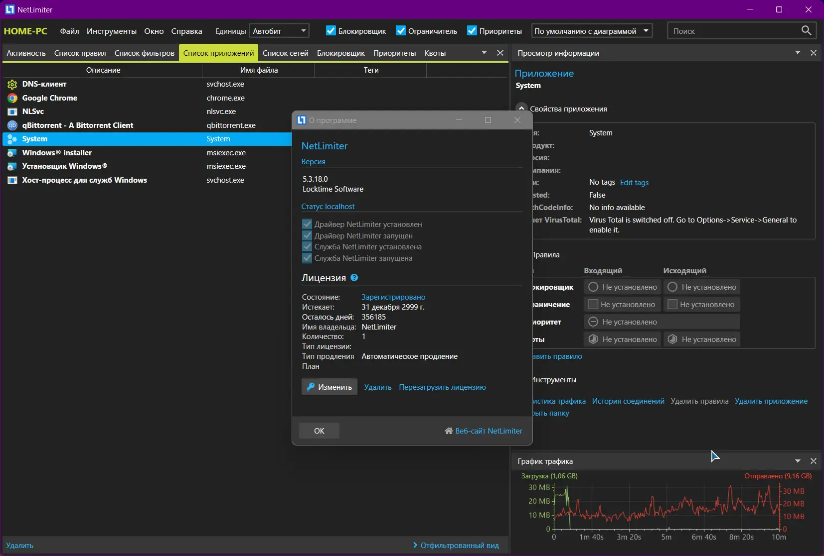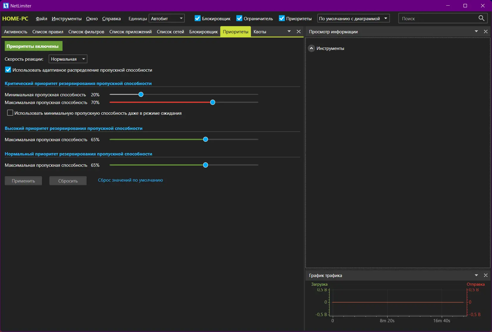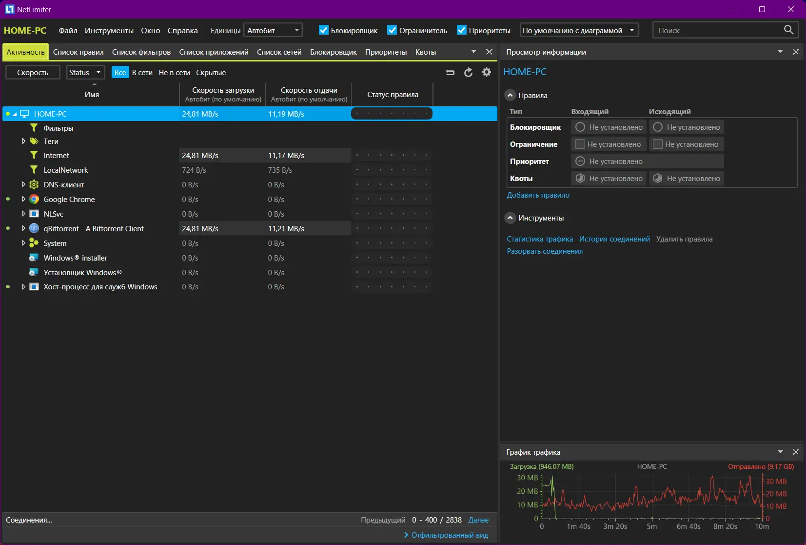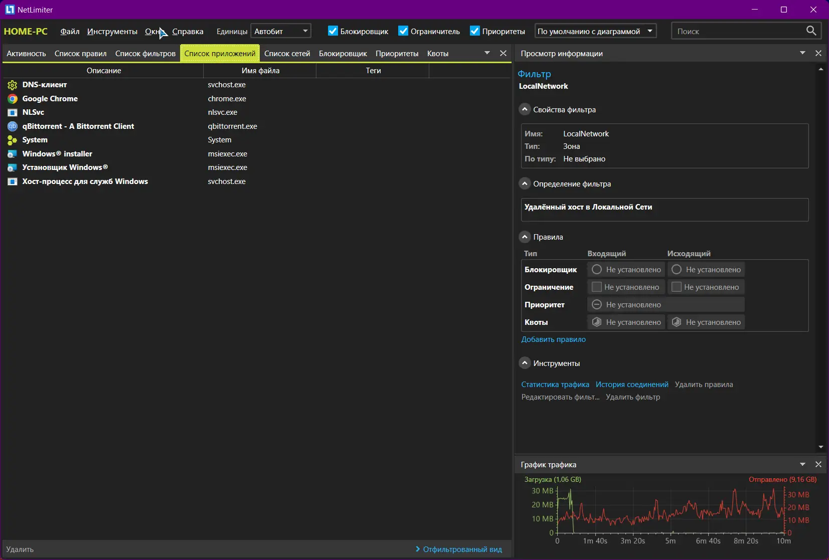 - Возможность установить лимиты на загрузку и выгрузку данных для отдельных программ.