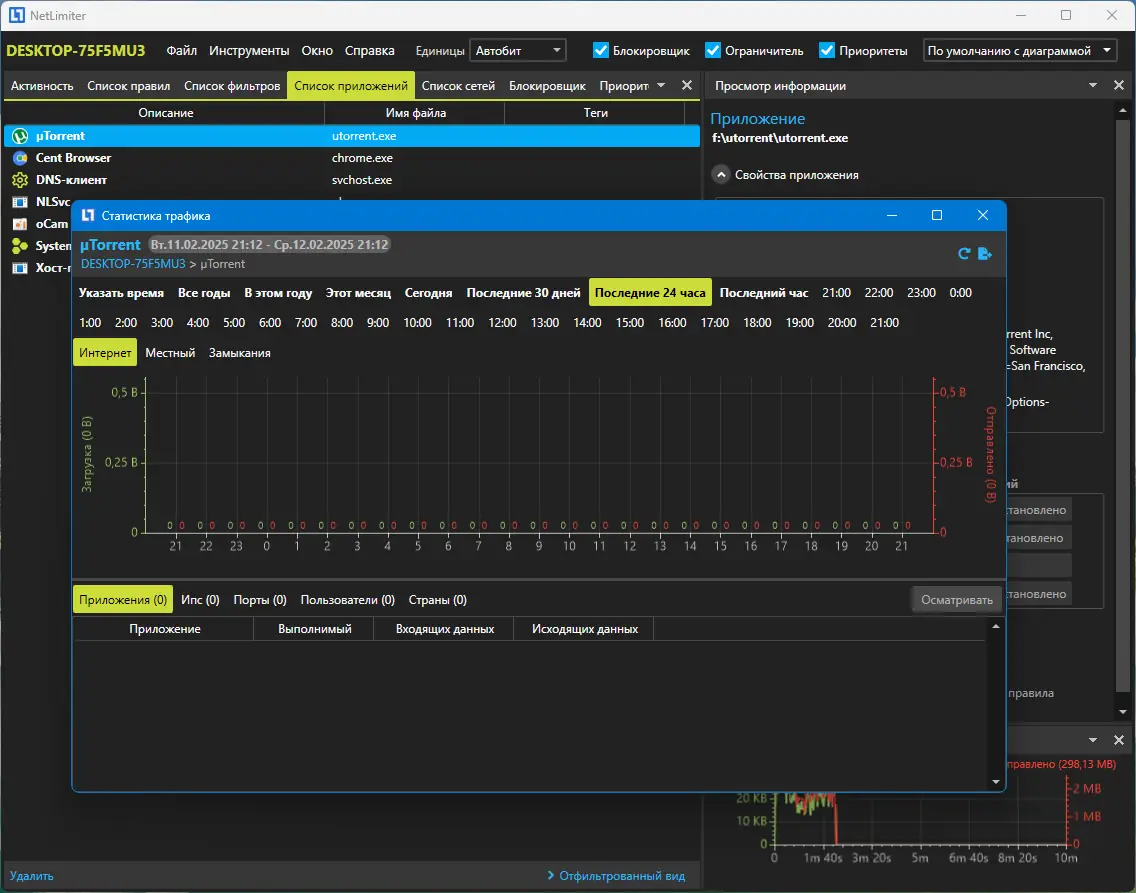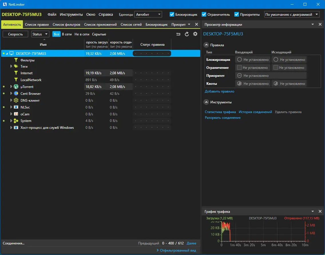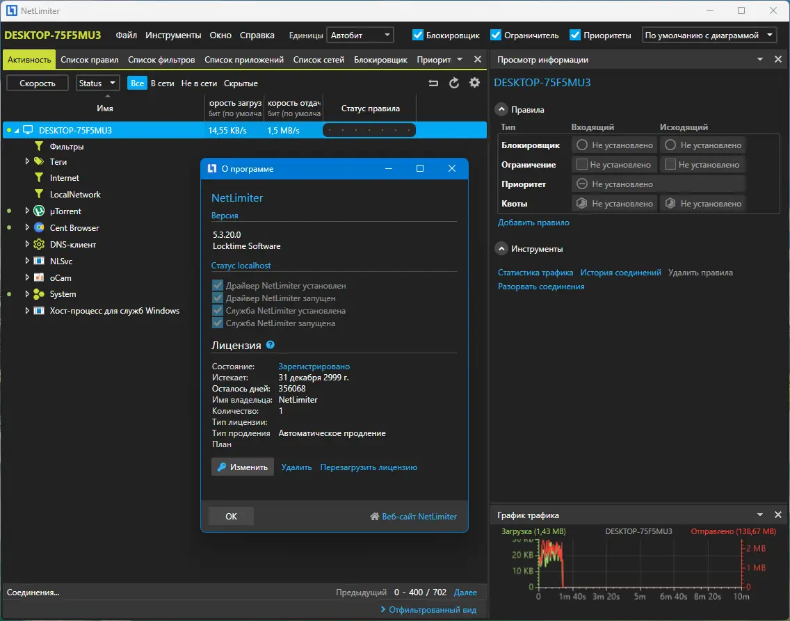 NetLimiter — это инструмент для детального контроля сетевого трафика на персональном компьютере, позволяющий отслеживать и управлять активностью каждого приложения в сети. Программа предоставляет возможность ограничивать скорость загрузки и выгрузки данных, настраивать приоритеты соединений и вести учёт передаваемой информации с подробной визуализацией.