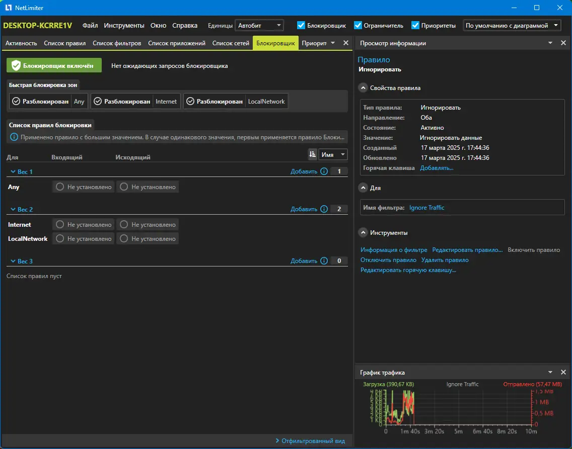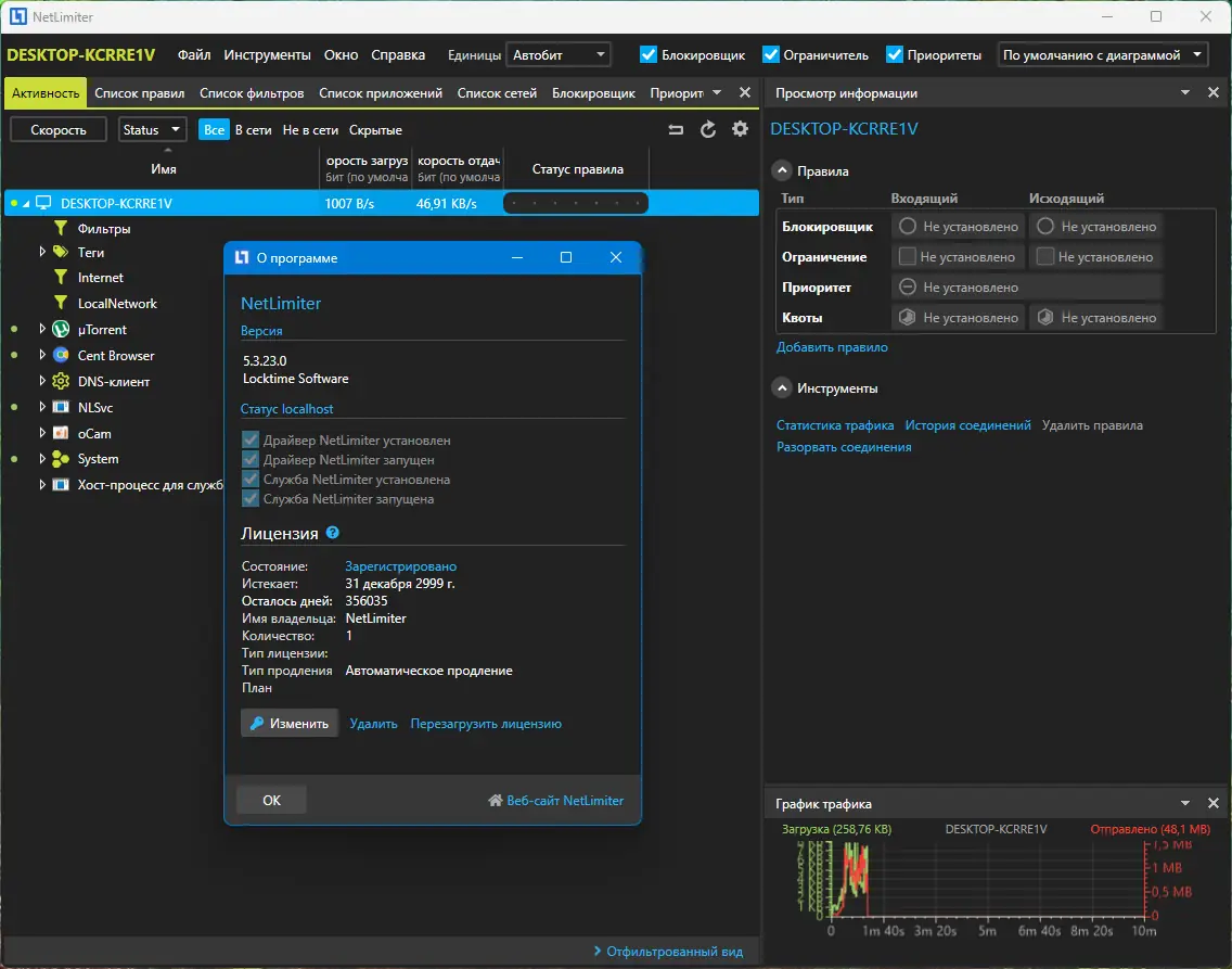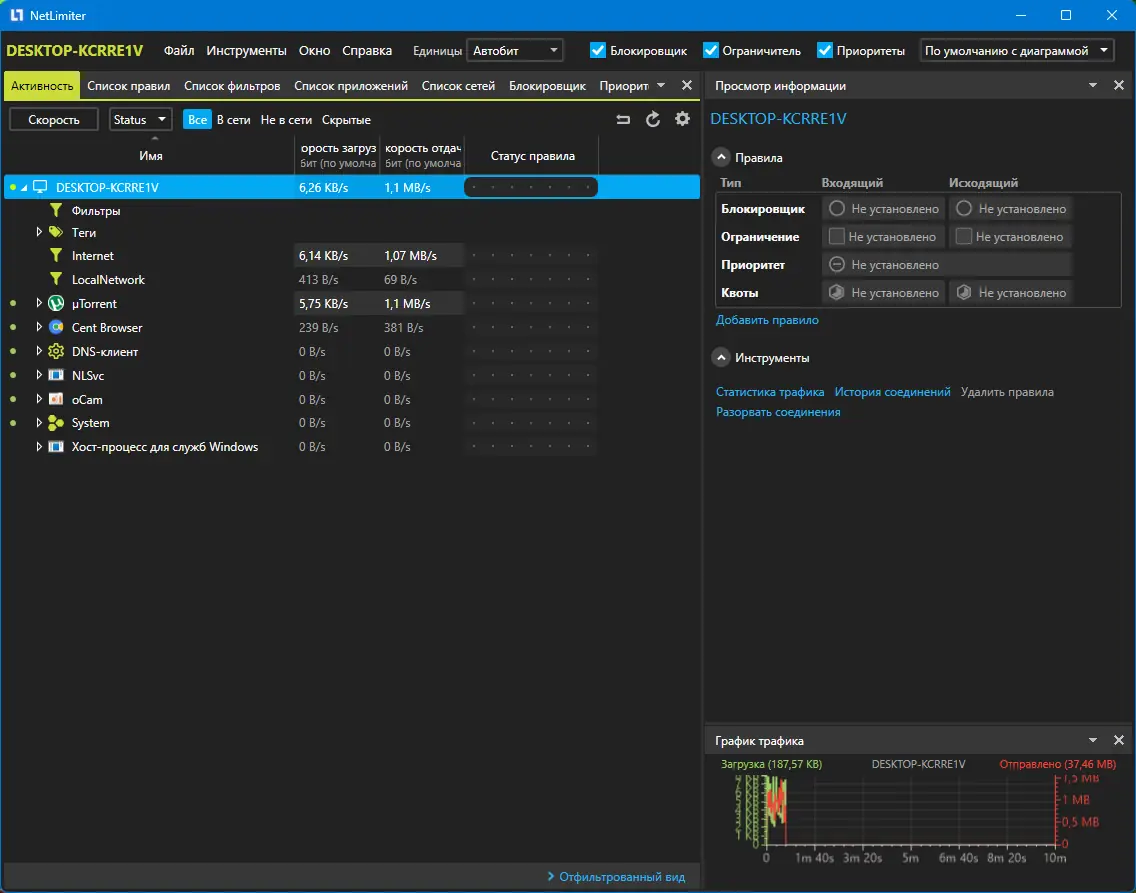 NetLimiter — это мощное приложение для детального контроля сетевого трафика, позволяющее отслеживать и управлять подключением каждого процесса на компьютере. Программа даёт возможность ограничивать скорость загрузки и отдачи, блокировать соединения, а также анализировать активность приложений в реальном времени.