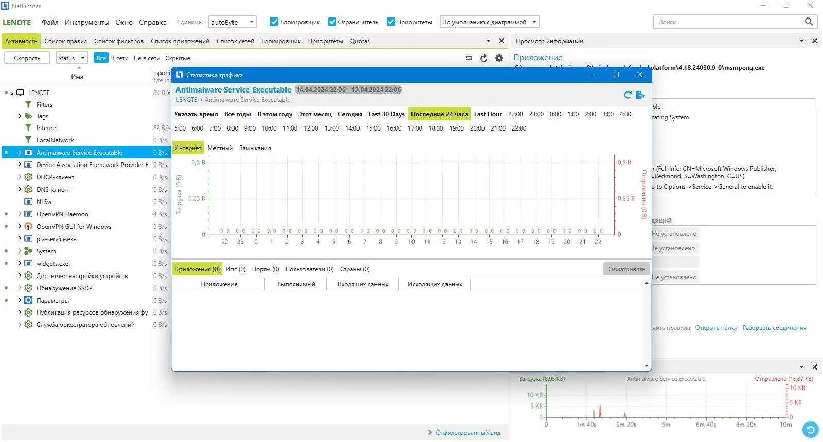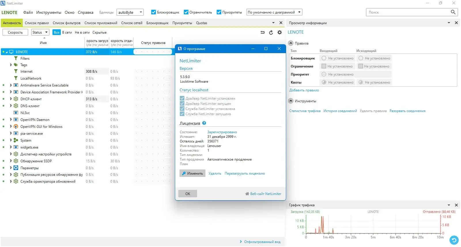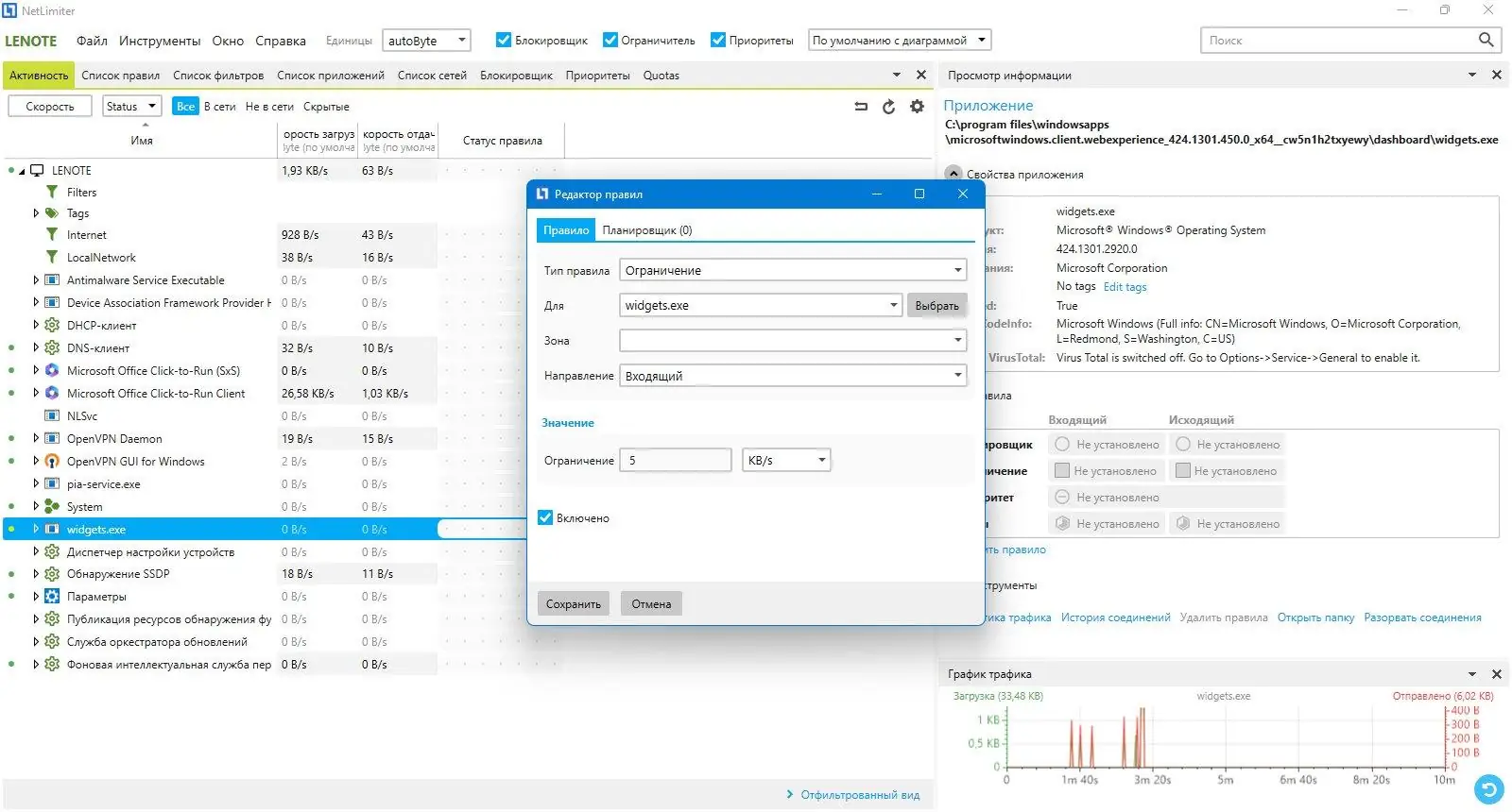 NetLimiter позволяет точно распределять интернет-канал между приложениями, предотвращая перегрузку сети.