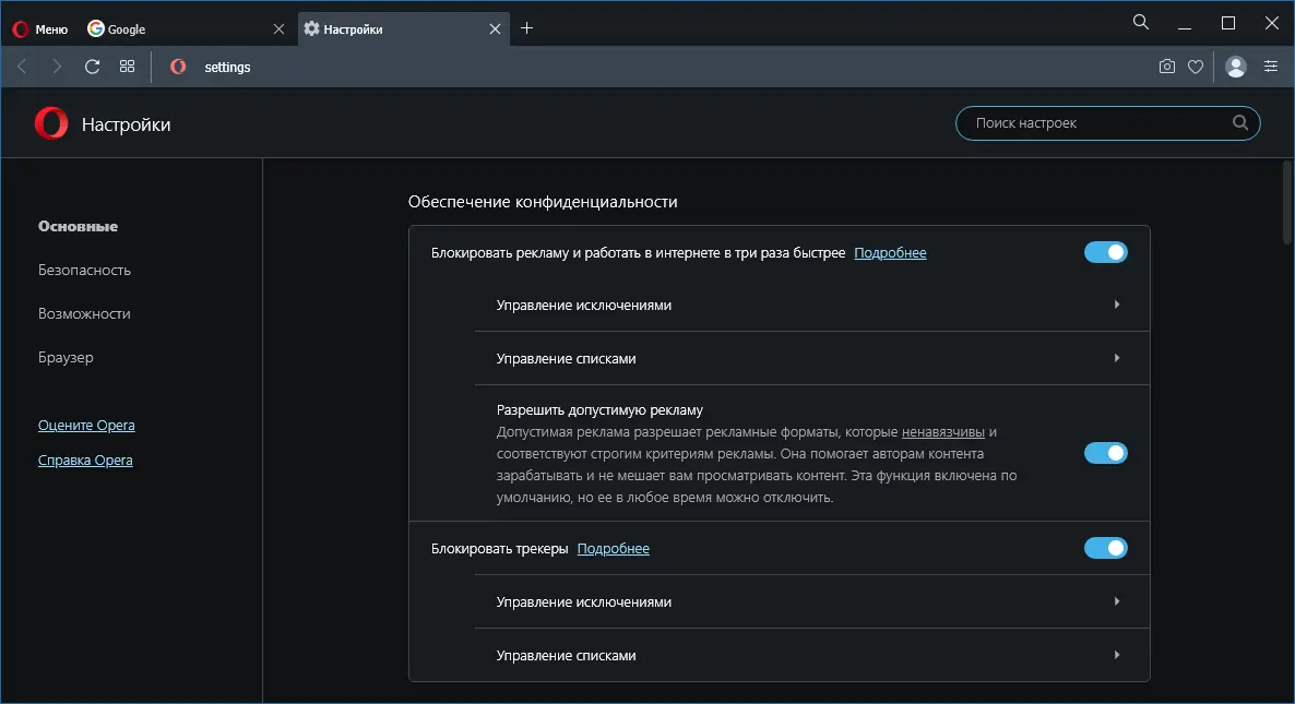 - Встроенный блокировщик рекламы и трекеров активен с первого запуска, ускоряя загрузку страниц и повышая приватность.