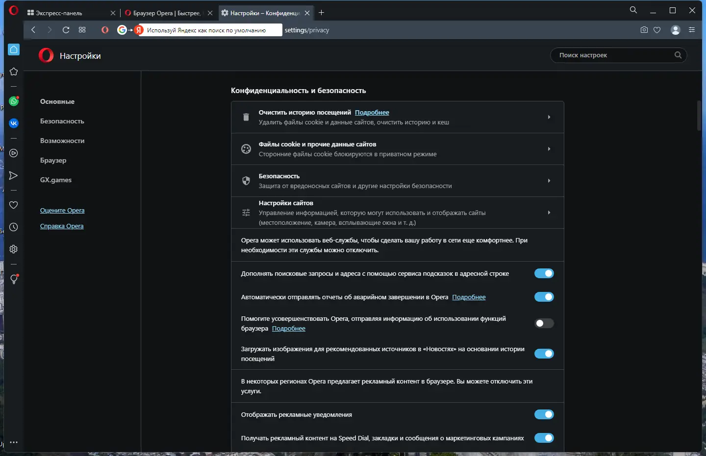 - Встроенный vpn повышает безопасность и анонимность при серфинге без подключения сторонних сервисов.